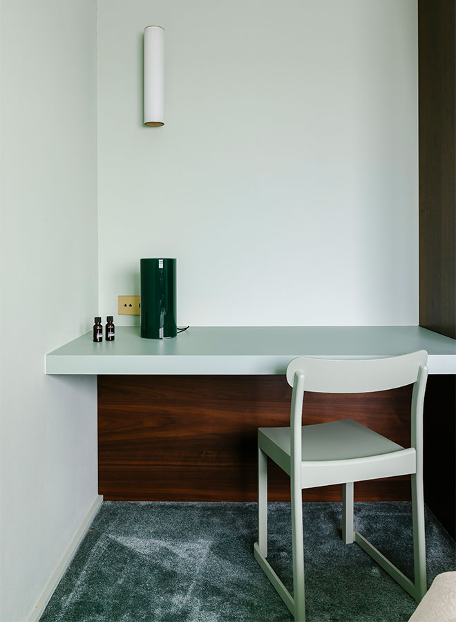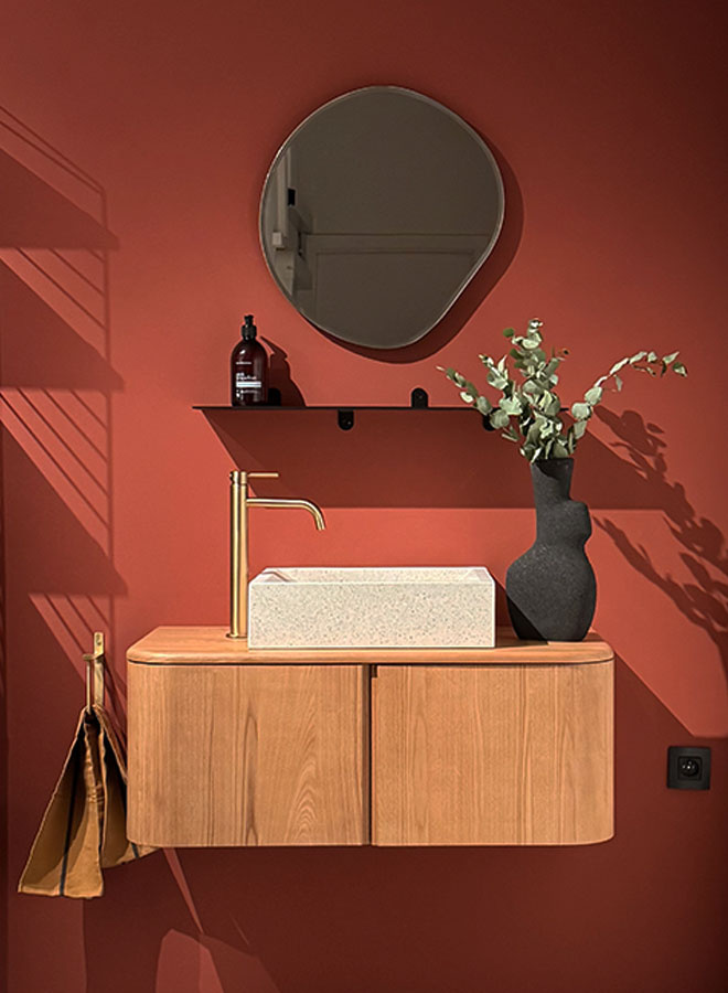 If your walls and floors are clean and minimal, you have the perfect canvas to start layering. This is where I often reach for SHADE paint, colours like Pistacchio ES20 or Soft Clay ES09 are subtle enough to let your materials shine, but still add warmth and personality. Once that’s in place, you can add shelves, textiles, and accents that pop against your base tone.