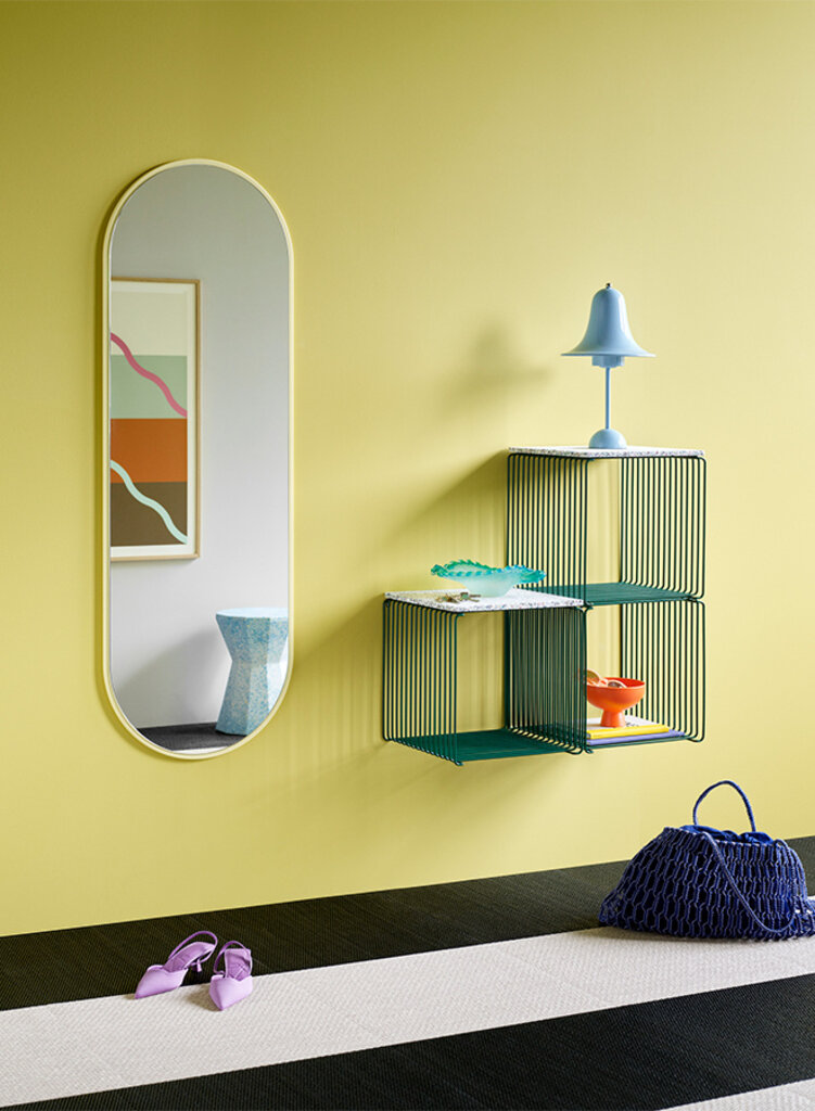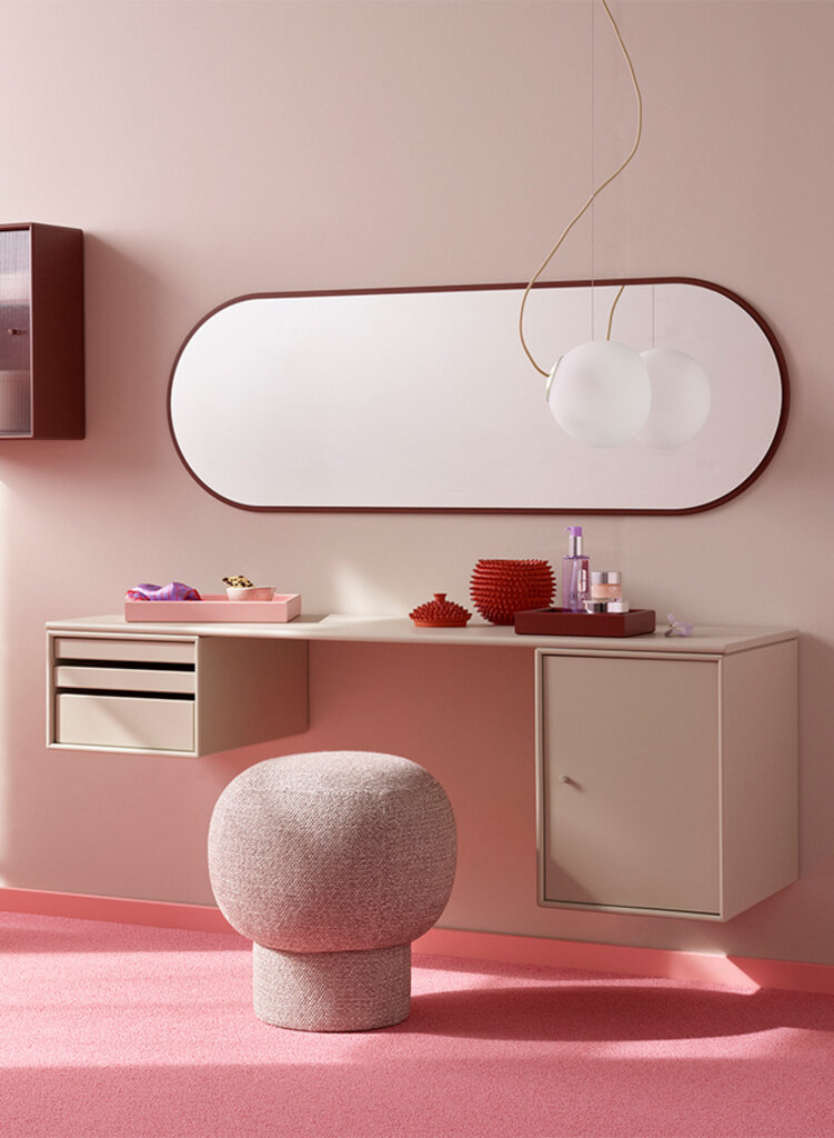FIGURE is a long oval mirror that fits perfectly in the bedroom or hall. FIGURE is designed as a full-figure mirror with a soft oval shape that compliments the sharper universe of the Montana shelving system.