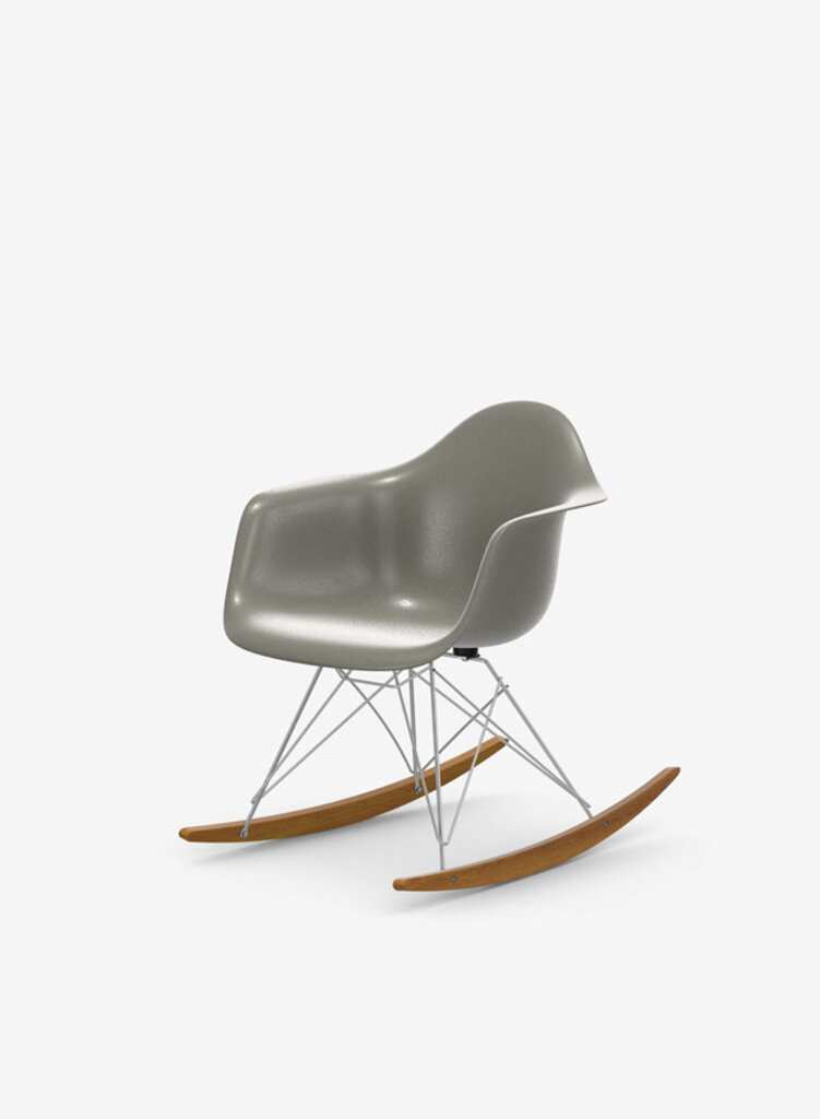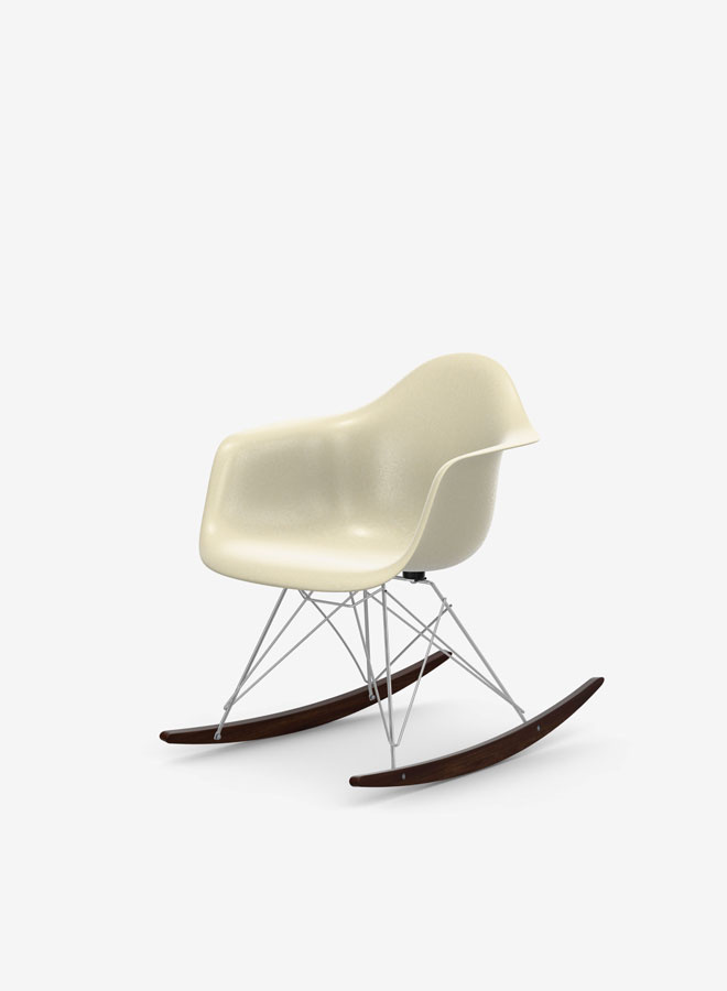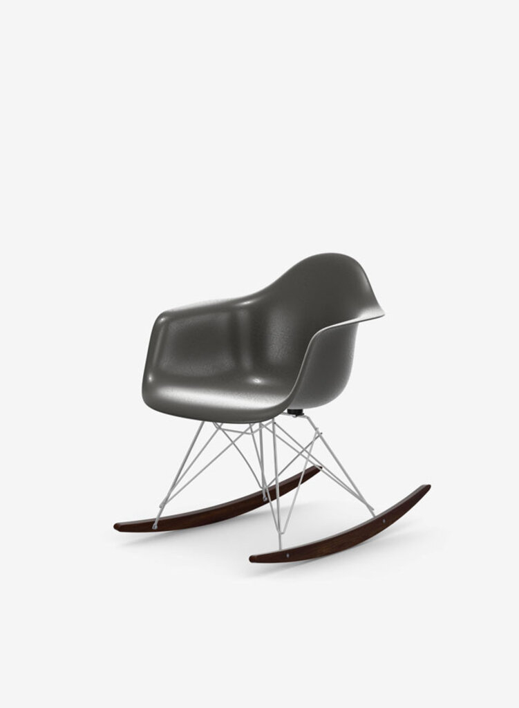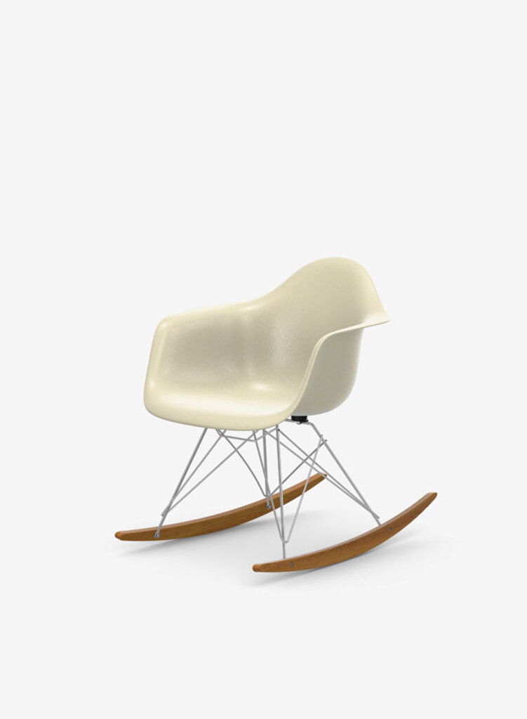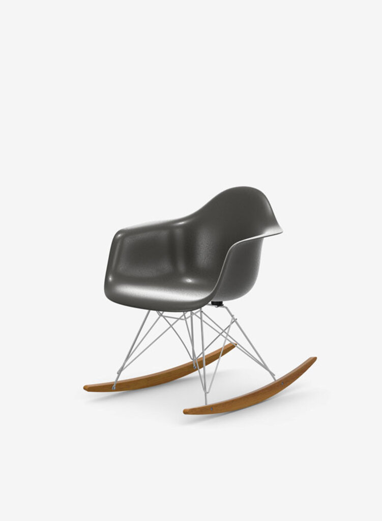 With the debut of this revolutionary design, Charles and Ray Eames introduced a new furniture typology that has since spread around the globe: the multifunctional chair whose shell can be joined with a variety of different bases. One model has always stood out in this large family of chairs: the Rocking Armchair Rod Base (RAR). The fibreglass version of the organically shaped RAR shell features the lively texture that is a hallmark of this material. The fascination of fibreglass lies in its irregular surface, whose clearly visible fibres make it appear almost like a natural material.