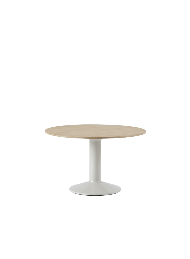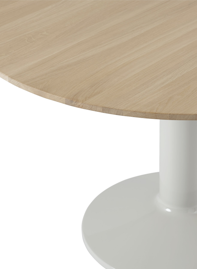 A natural focal point of the home, the Midst Table is a generous, round dining table where friends and family gather—and there is always room to squeeze in one more guest. Its refined silhouette is simple yet characteristic, enhanced by distinct detailing and contrasting materiality—matte solid oak or linoleum on a monolithic base made of spun steel with a durable high-gloss finish.