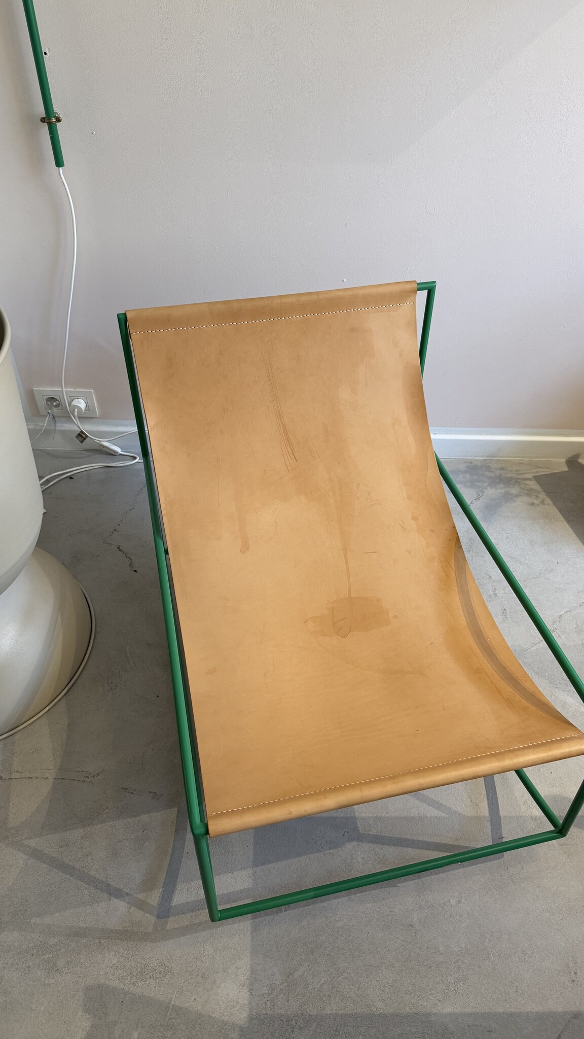 Rocking Chair features a minimalist steel frame combined with a leather seat, creating a clean and timeless silhouette.