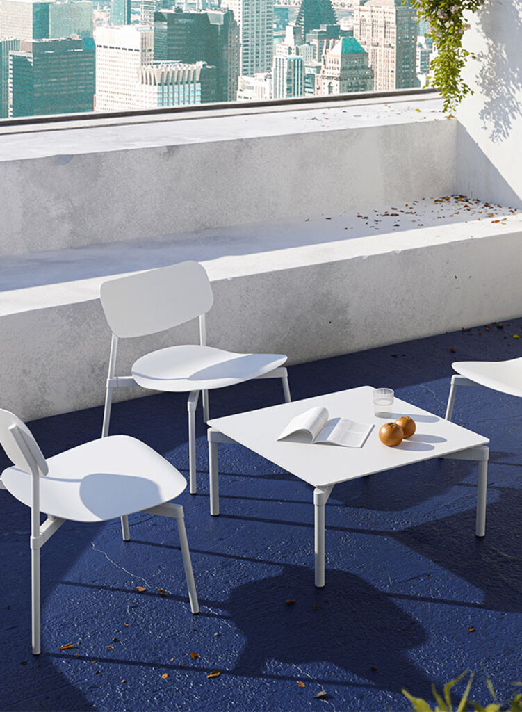 Designer Tom Chung's brief for the iconic FROMME collection was to create furniture with a minimalist design and slender lines. Inspired by the technical properties and sleek, streamlined lines of a racing bike, shock absorbers have been placed under the tops of the tables in the collection. Made from aluminium, a recyclable and resistant material, the collection can be used both indoors and outdoors.