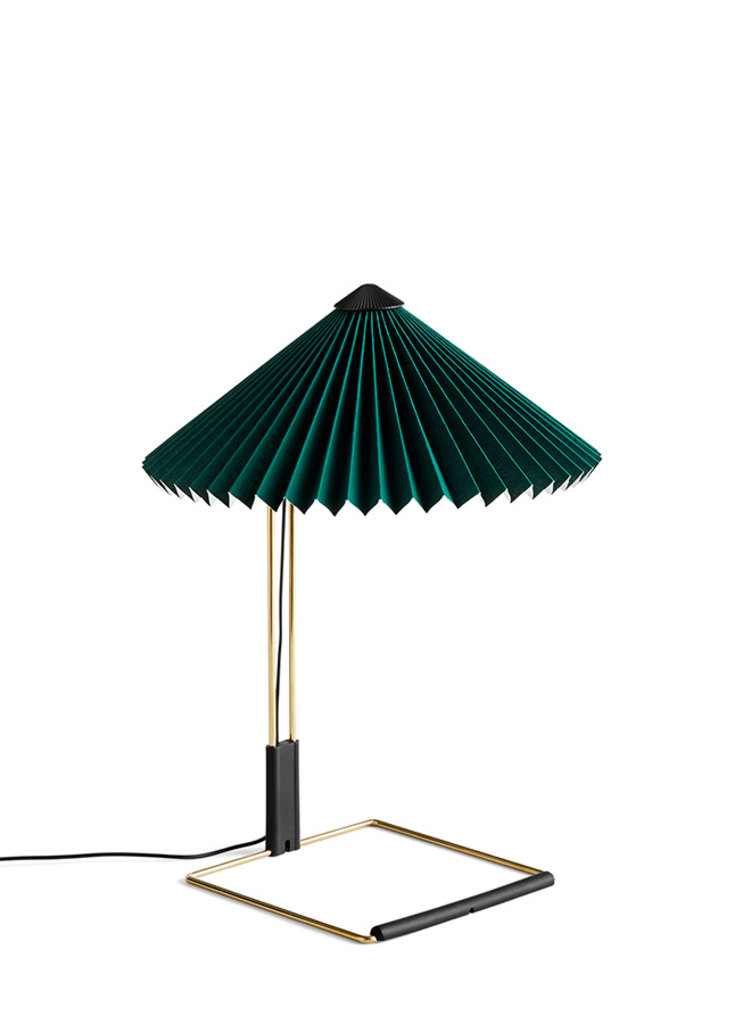 The Matin table lamp offers a contemporary yet poetic design, with a construction that combines visual delicacy with physical robustness. It consists of a steel wire bent frame finished in polished brass with matte black hardware, and is paired with a pleated cotton shade in a variety of vibrant colours. The light source is an integrated LED, offering a diffused downlight which is accompanied by a digital in-line dimmer control to adjust the output of light if required.